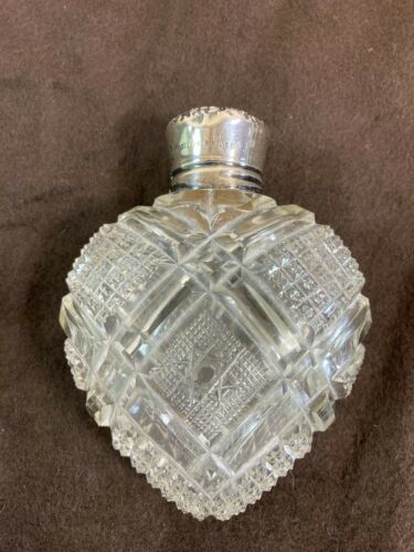 Victorian cut crystal sterling silver heart shape perfume bottle flask