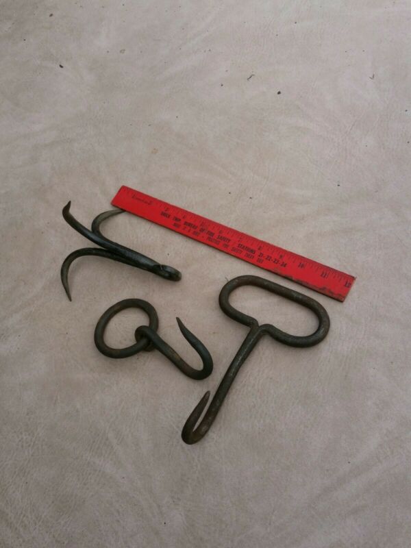 Title (ebay affiliate link): 3 VINTAGE ANTIQUE HAND FORGED IRON FARM TOOLS, PRIMITIVE HOOKS
