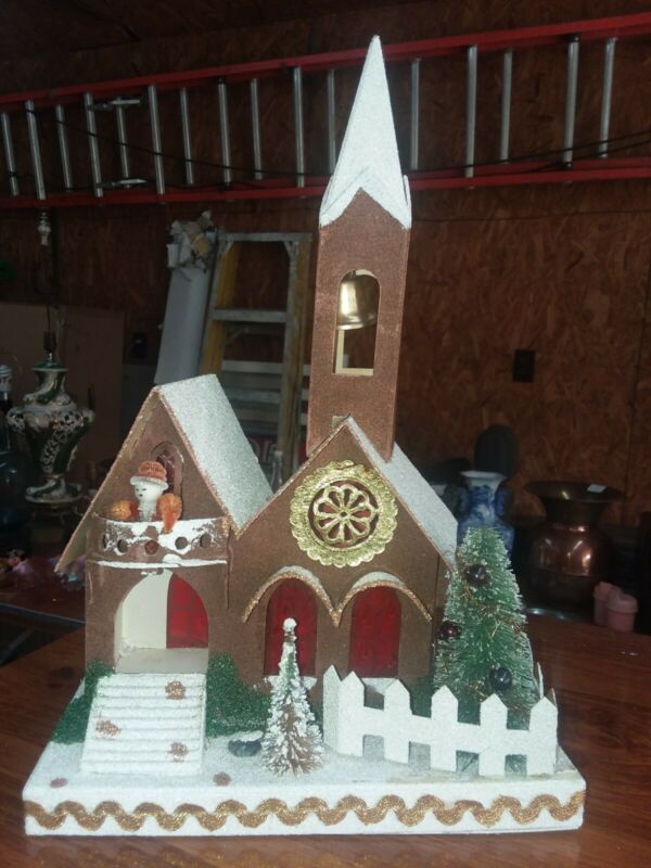 Title (ebay affiliate link): Vintage Christmas Village Mica Cardboard Putz House Church w/ man