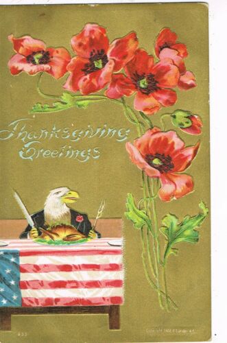 ANTIQUE THANKSGIVING Postcard DRESSED EAGLE AT TABLE, AMERICAN FLAG TABLECLOTH