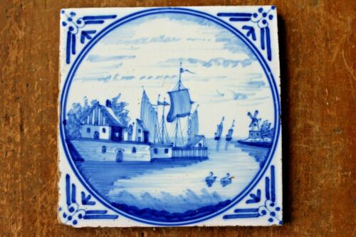 Title (ebay affiliate link): Antique Tall Ship Dock Windmill Buildings Delft tin glazed 17th century TILE