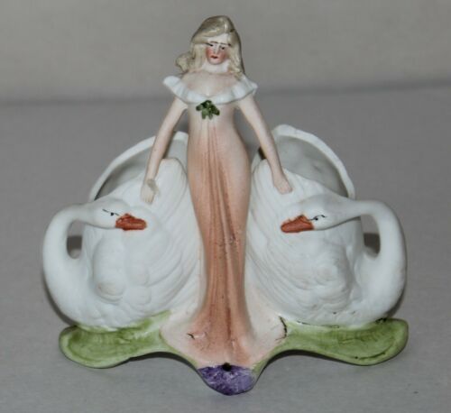 Title (ebay affiliate link): ANTIQUE Bisque LADY & SWANS Figural Toothpick Holder ART NOUVEAU Vase