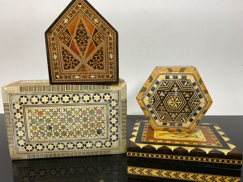 Title (ebay affiliate link): Vintage 4pc Inlaid Marquetry Wood Bovine Bone Hinged Jewelry Trinket Boxes