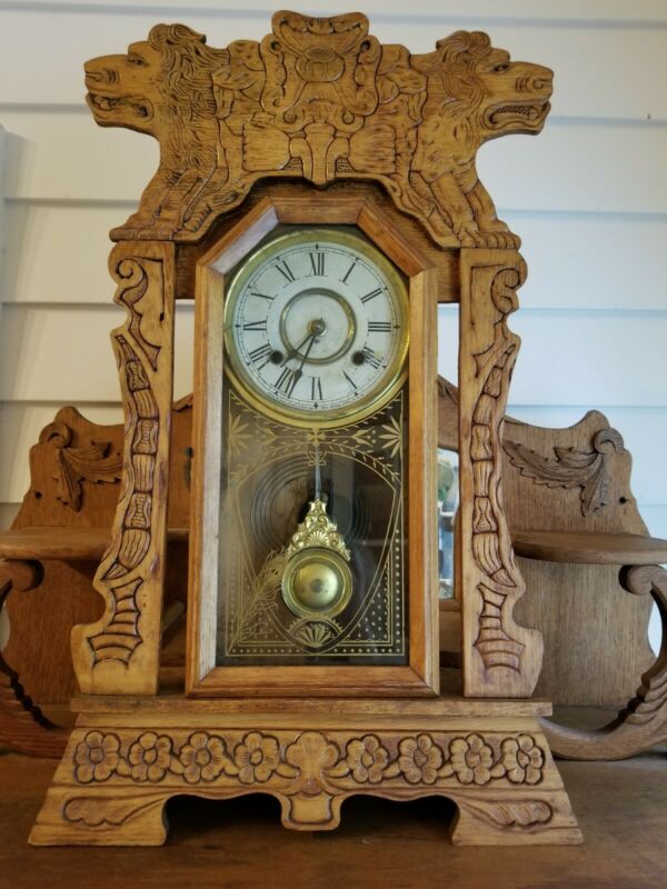 Title (ebay affiliate link): New Haven Antique Lion Carved Oak Gingerbread Clock 25" tall
