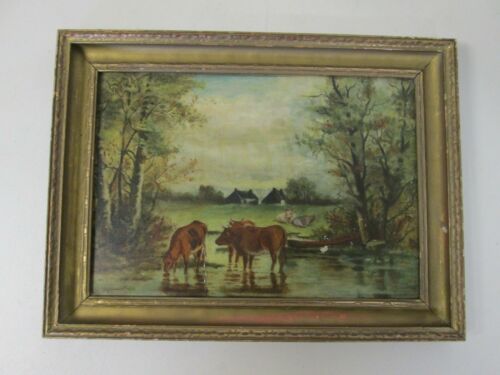 Title (ebay affiliate link): ANTIQUE ORIGINAL OIL ON BOARD PAINTING OF CATTLE WATERING