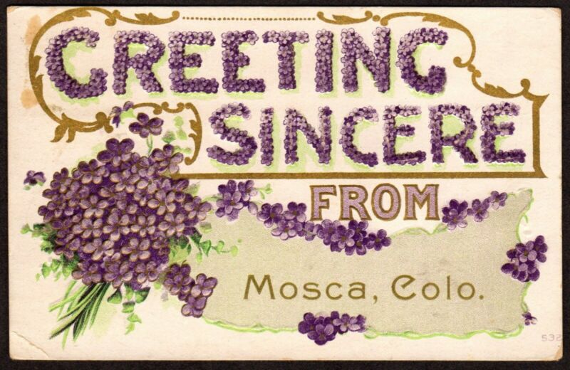 Embossed-Greetings from Mosca, Colo, with Mosca cancel, violets