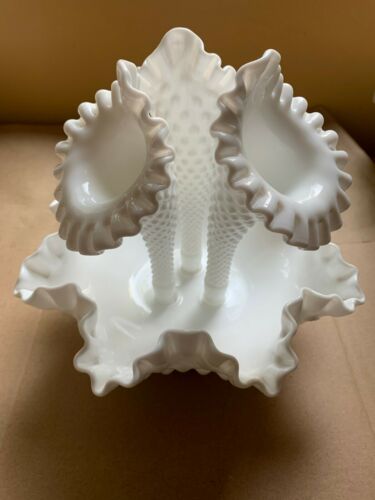 Title (ebay affiliate link): Vintage Fenton 4-Piece Epergne Hobnail White Milk Glass 3 Horn Ruffled