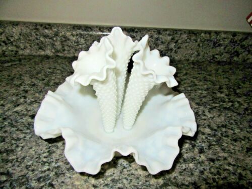 VINTAGE FENTON WHITE HOBNAIL MILK GLASS RUFFLED EPERGNE 3 HORN BUD VASE