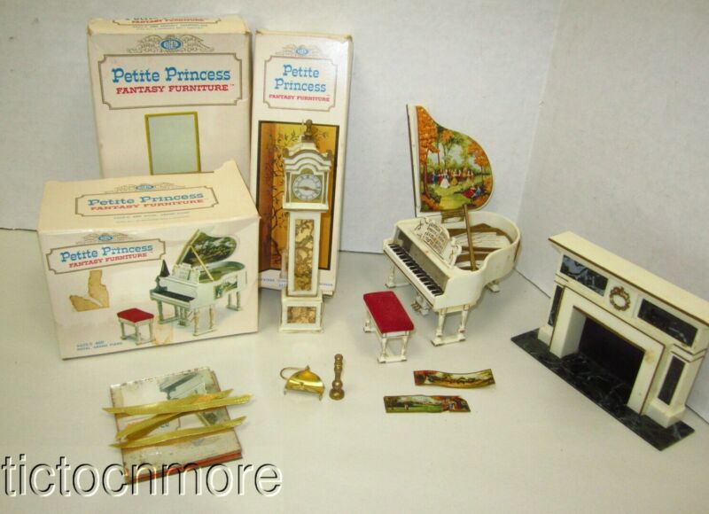 VINTAGE IDEAL PRETTY PRINCESS DOLLHOUSE FURNITURE LIVING ROOM CLOCK PIANO HEARTH