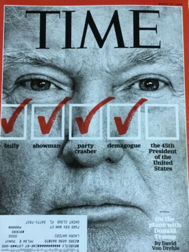 Title (ebay affiliate link): TIME Magazine. March 14, 2015. Bully. Showman. Party Crasher. Demagogue. TRUMP.