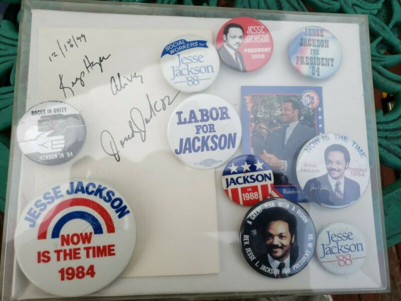 Title (ebay affiliate link): Jesse Jackson autograph & campaign buttons. Years ''84, ''88, & 2000. Frame-kept.