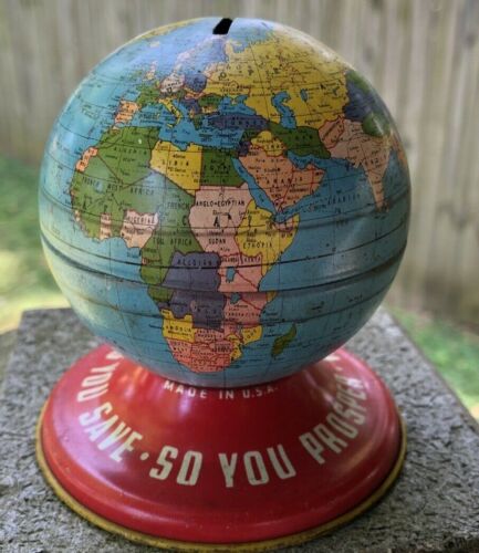 Title (ebay affiliate link): Vintage 1950s Ohio Art Co. Tin Litho World Globe Coin Bank Toy Used Excellent