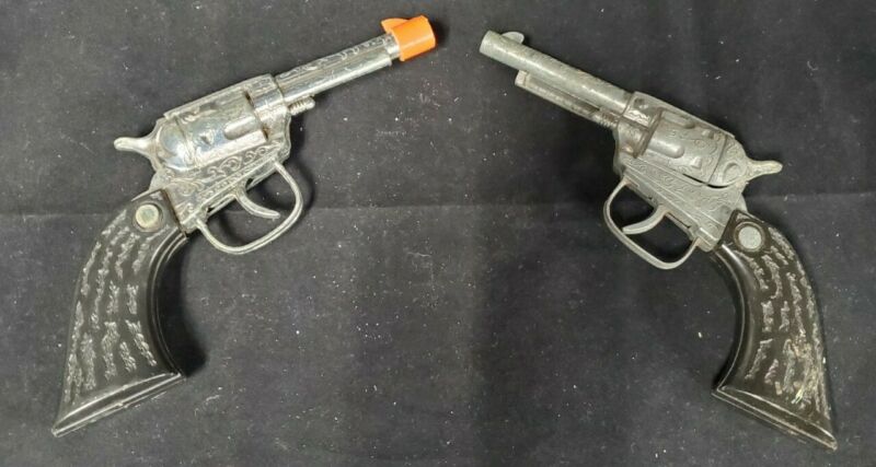 2 Vintage Toy Cap Gun Indian Head Grip Cowboy Die Cast Metal w/ Black Handle