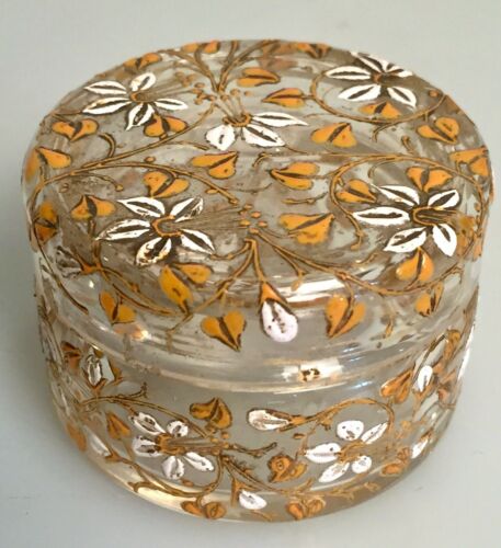 Antique Victorian Glass & Enamel Painted Round Trinket Box Dresser Jar