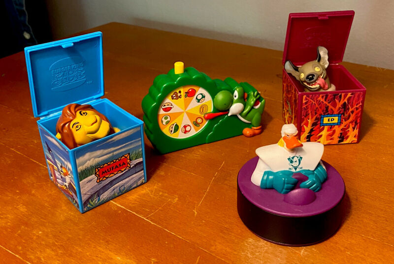 Title (ebay affiliate link): Vintage Toy Lot, Burger King Lion King, Mighty Duck Toy Puck, Yoshi Wheel