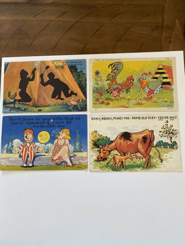 Title (ebay affiliate link): Vintage Postcards Comic Humor Cows, Chickens, Husband/wife Camping.