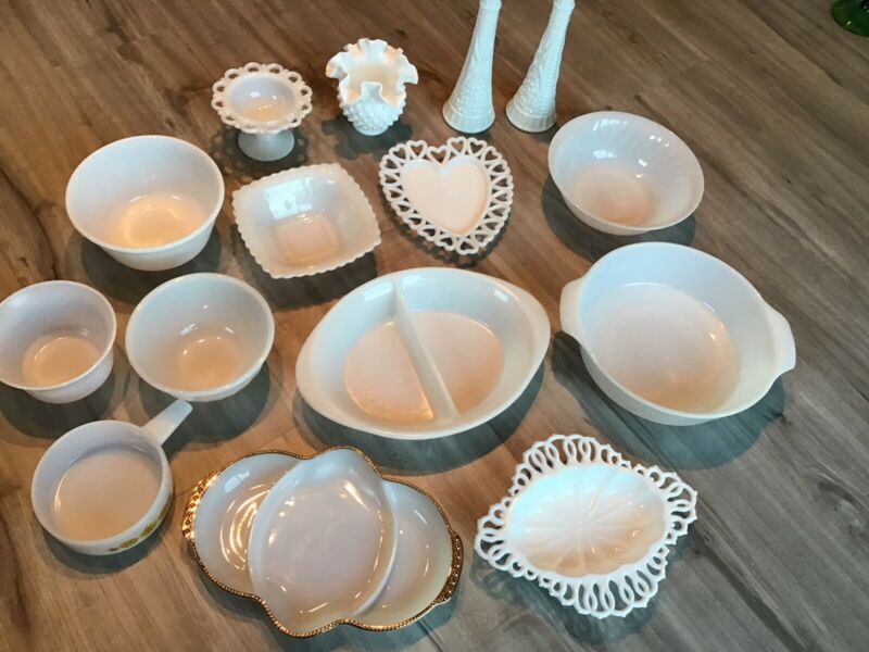 Title (ebay affiliate link): Vintage White Milk Glass Lot Fire King Anchor Hocking Serving Dishes Bowls Vases
