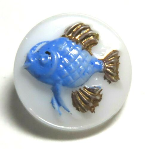 Title (ebay affiliate link): ADORABLE 1940''S MILK GLASS CHILD''S BUTTON w/BLUE ENAMEL & GOLD LUSTER "FISH"