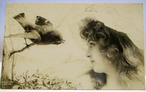 Title (ebay affiliate link): 1917 REAL PHOTO POSTCARD SONGBIRD CHIRPING AT VICTORIAN GIRL, CLOSE-UP