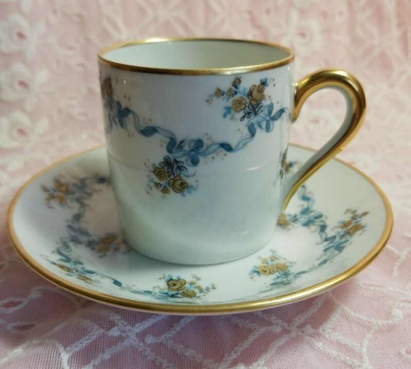 Vintage Limoges Blue Floral & Gold Gilt Demitasse Cup & Saucer Beautiful!