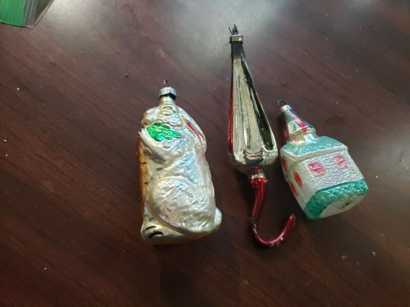 Title (ebay affiliate link): ANTIQUE CHRISTMAS ORNAMENTS GLASS RABBIT, UMBRELLA AND HOUSE
