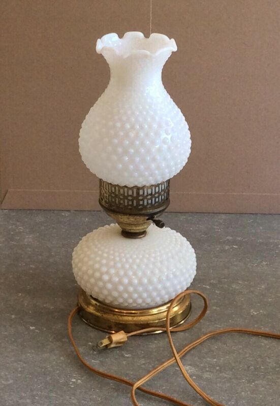 Title (ebay affiliate link): Vintage White Milk Glass Hobnail Dresser Lamp With Chimney