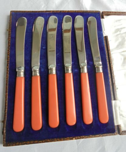 Title (ebay affiliate link): Art Deco silver plate butter knives with coral Bakelite handles