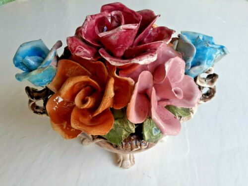 Vintage Capodimonte Pot, red, pink, blue, yellow & orange roses, 7" tall 9" wide