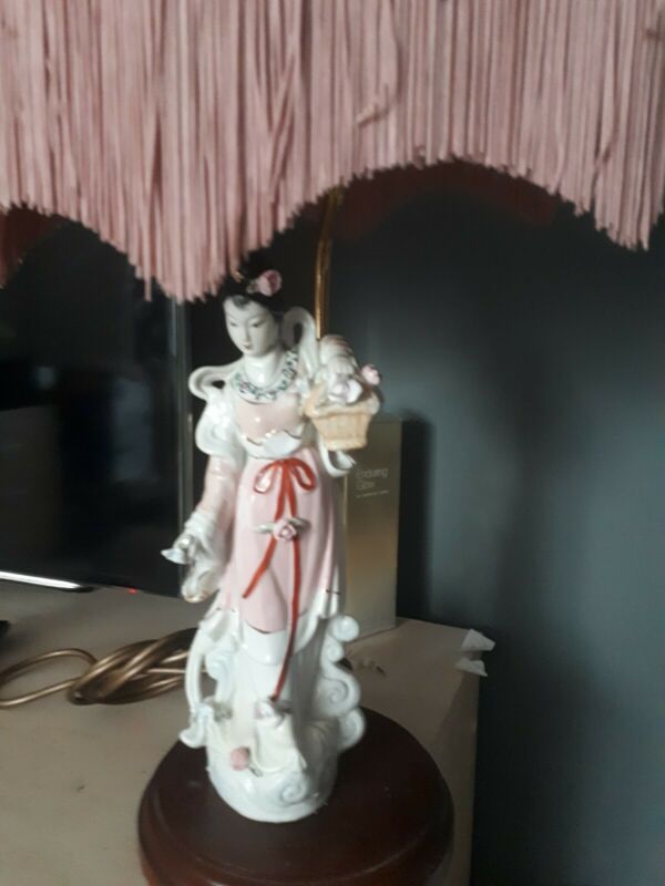 Title (ebay affiliate link): Vintage oriental style Table Lamp Light Shade is pink ,stand geisha porcelain.