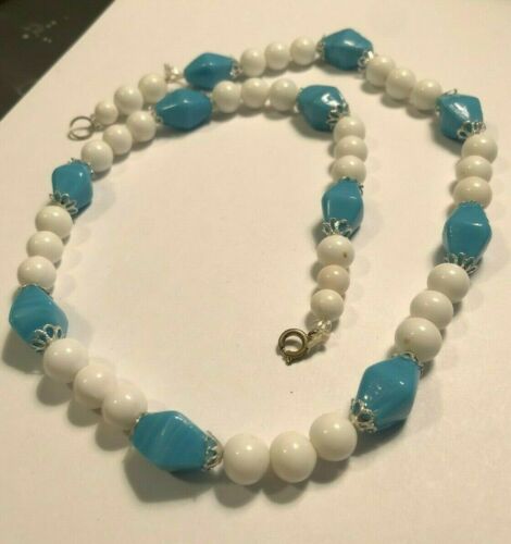 Vintage Jewelry Necklace Strand Milk Glass Beads White and Blue 11