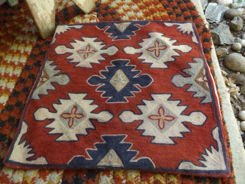 Primitive Vintage Hand Made Wool Pillow Case 16 1/2" X 15 1/2" Rust Tan Blue