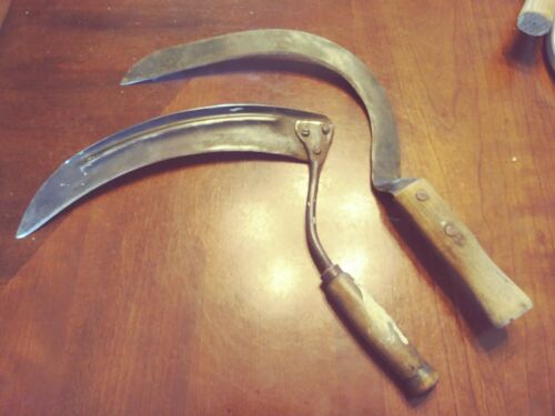 Title (ebay affiliate link): 2 Vintage Wood Handle Hand Scythe Sickle Farm Tool Grass Weed Corn Hook