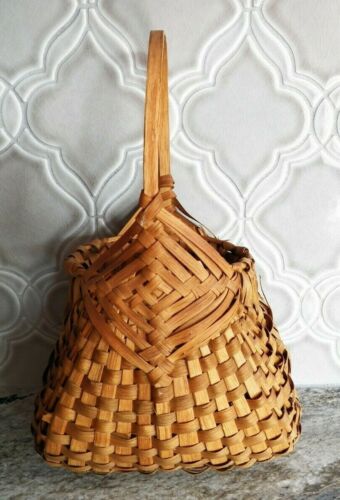 Title (ebay affiliate link): ANTIQUE PRIMITIVE~HAND WOVEN SPLINT BASKET~UNIQUE SHAPE~GODS EYE~BENT HANDLE