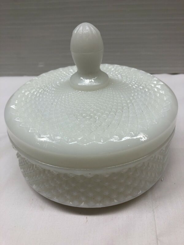 Milk Glass~Covered~Candy Dish~Lid Finial~Diamond Cut