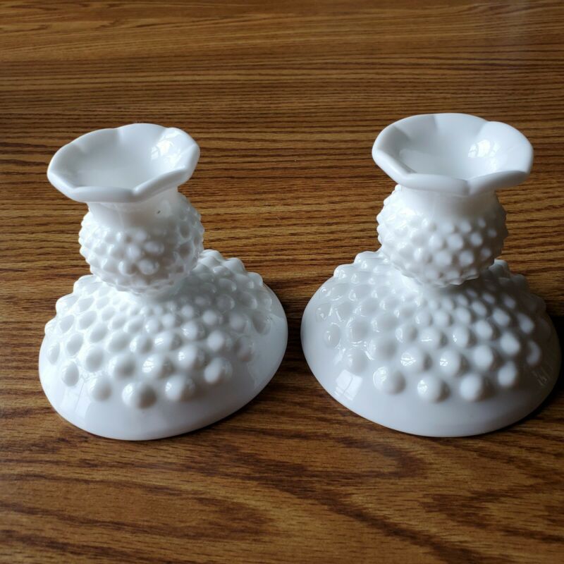 Title (ebay affiliate link): Fenton Hobnail Milk Glass Candlestick Holders. Vintage in Excellent Condition.