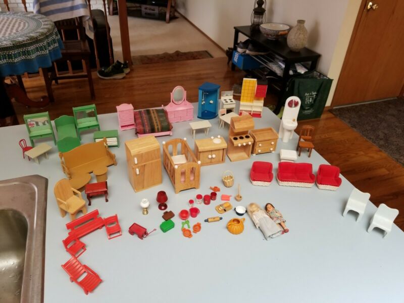 Title (ebay affiliate link): LOT OF 40+ VINTAGE DOLL HOUSE FURNITURE MINIATURES VARIOUS ROOMS