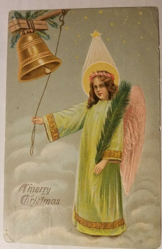 Title (ebay affiliate link): Vintage c1910 Christmas Postcard Angel w/ Palm Leaf + Halo Ringing Gold Bell
