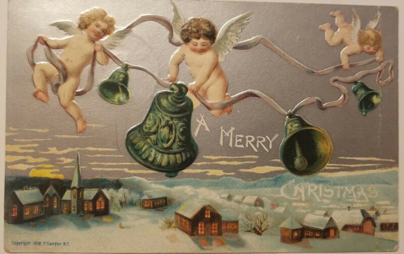 Title (ebay affiliate link): Vintage 1908 Christmas Postcard Cherub-Angels w/ Bells Above Snowy Village