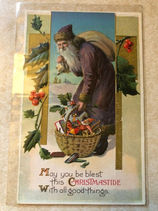 Title (ebay affiliate link): Antique 1913 embossed CHRISTMAS Post Card SANTA in Purple Suit with Xmas Toys