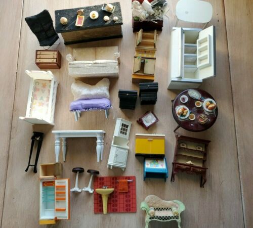 Vtg. Upholstered, Wood, Plastic Dollhouse Furniture couch, kitchen, dining, bed