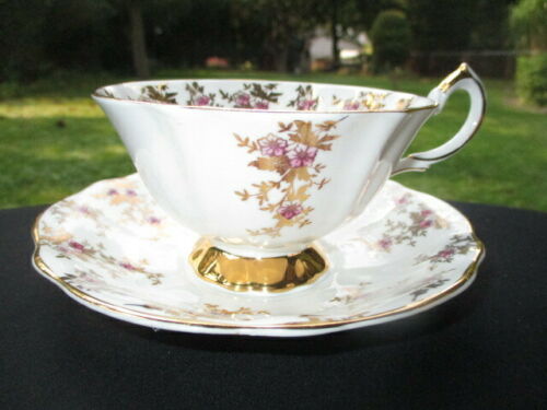 CUP SAUCER QUEEN ANNE WIDE MOUTH FOOTED BEAUTY PENDANTS GOLD AMETHYST PRIMROSES
