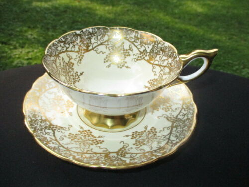 CUP SAUCER ROYAL STAFFORD WIDE MOUTH FOOTED GOLD ON CREAM HARVEST GRAPE VINES