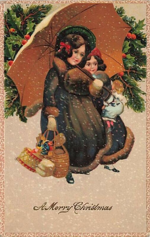 Title (ebay affiliate link): "A Merry Christmas" Young Girl Long Coat Umbrella Carrying Gifts Postcard