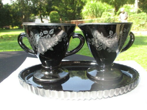BLACK OVIDE HAZEL ATLAS DEPRESSION GLASS CREAM SUGAR & TRAY GHOST ROSES