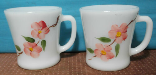 Two Vtg Fire King PEACH BLOSSOM Pink Flower GAY FAD Milk Glass D Handle Cup MUGS