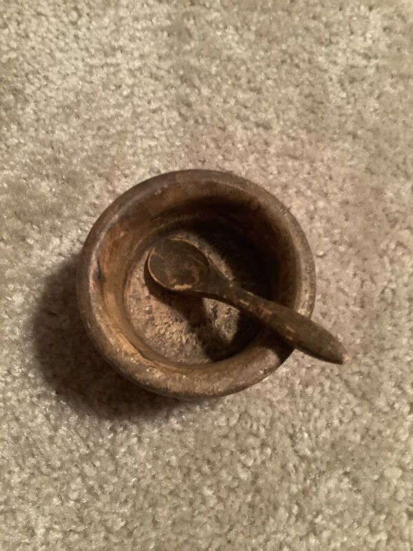 Primitive Hand Turned Wooden Salt Bowl And Spoon