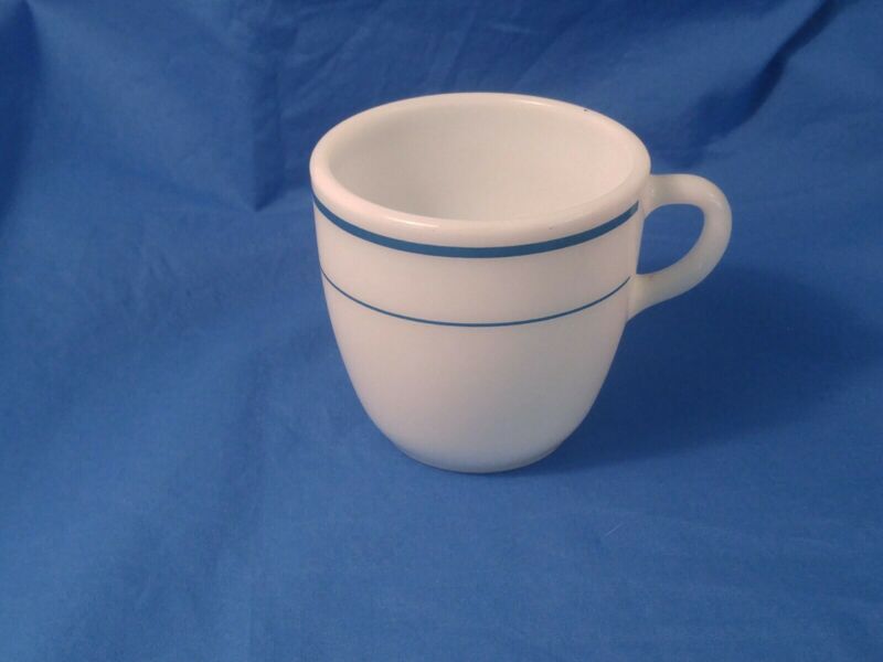 Title (ebay affiliate link): Pyrex Milk Glass Coffee Cup Corning Blue Stripe Band 723 USA