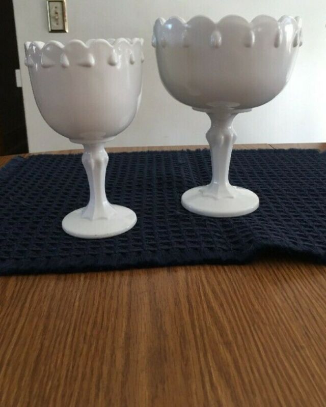 Title (ebay affiliate link): Pair 2 Vintage Indiana Milk Glass White Tear Drop Pedestal Compote Fruit Bowl