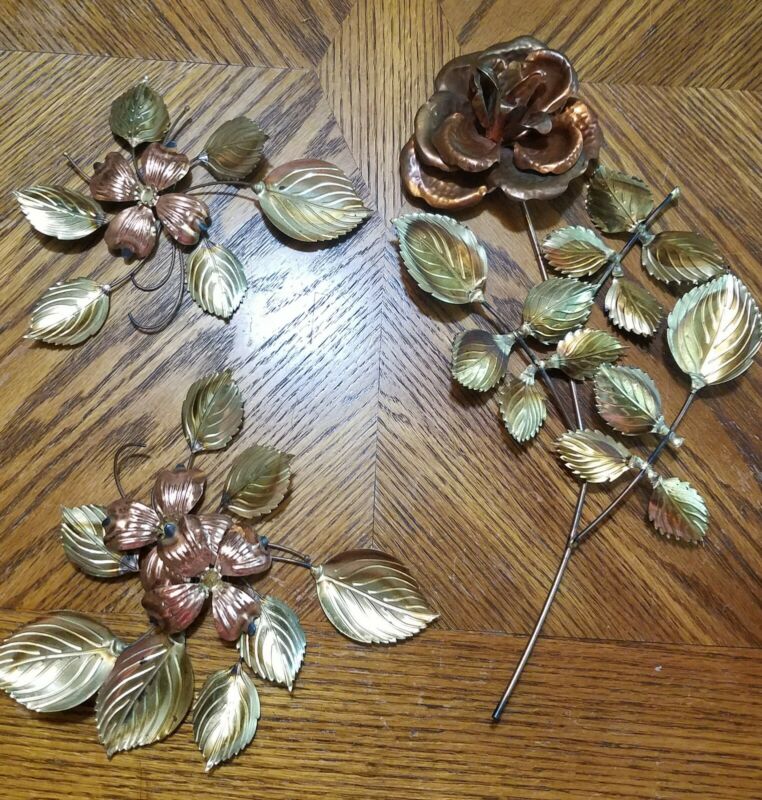 Vtg. Copper & Brass Tin Flower & Leaves Wall Hanging Art