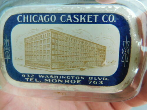 Rare Vintage Antique glass Advertisement Paperweight Chicago Casket Co Factory